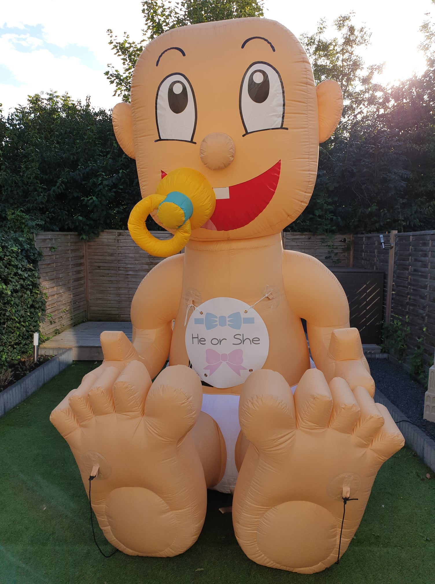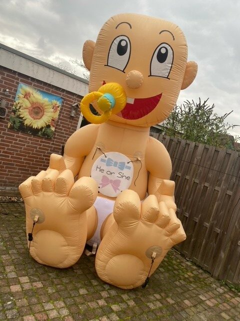 Bij een babyshower hoort de moeder extra verwent te worden. Hoe leuk is het als er een baby van 3 meter hoog in de voortuin zou staan met een banner; He or She